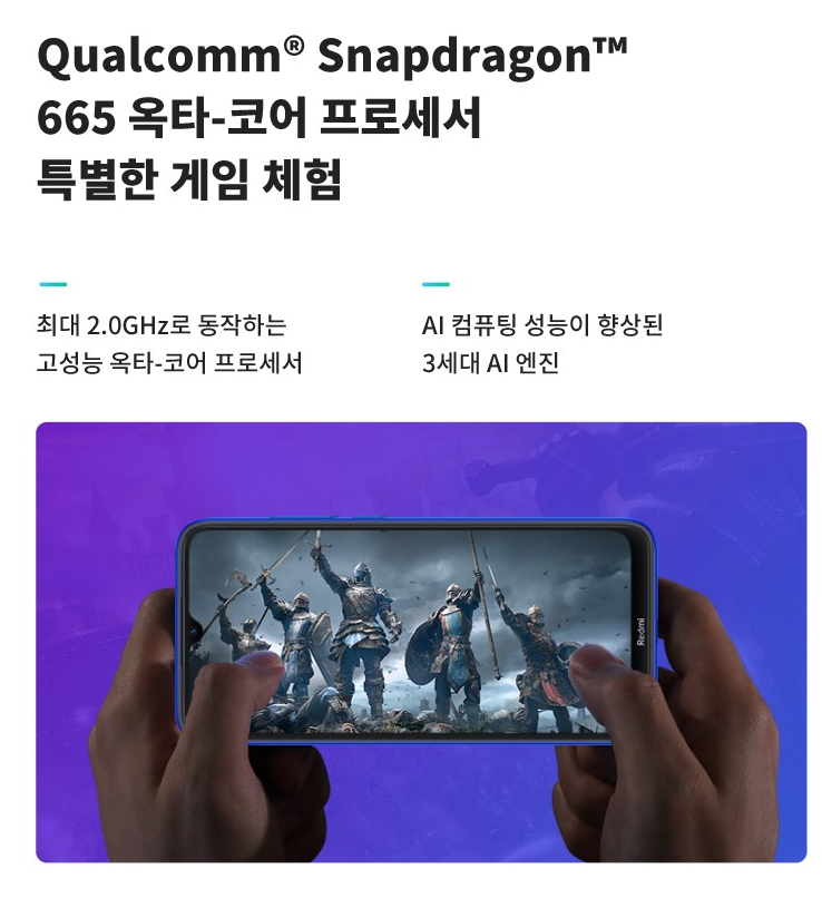 고성능 CPU가 탑재된 샤오미 홍미노트8T에는 퀄컴 스냅드래곤 665 옥타 코어 프로세서가 탑재되어 향상된 엔진으로 게임을 즐길 수 있어요.